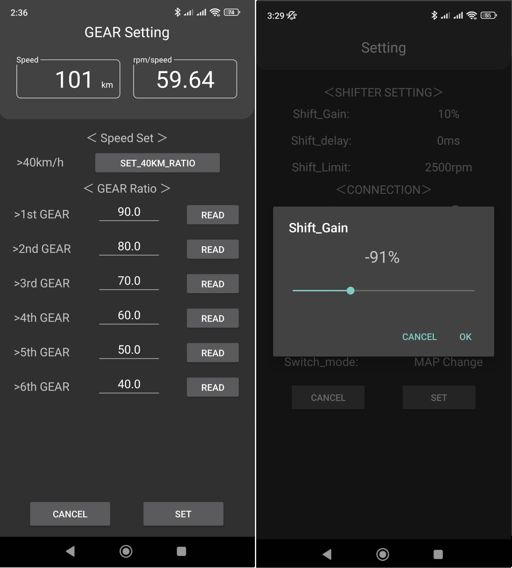 ※公道向けモデルのギアレートセッティング済み、(MAP1)ツーリング向け/(MAP2)ワインディング向け初期データ入り。